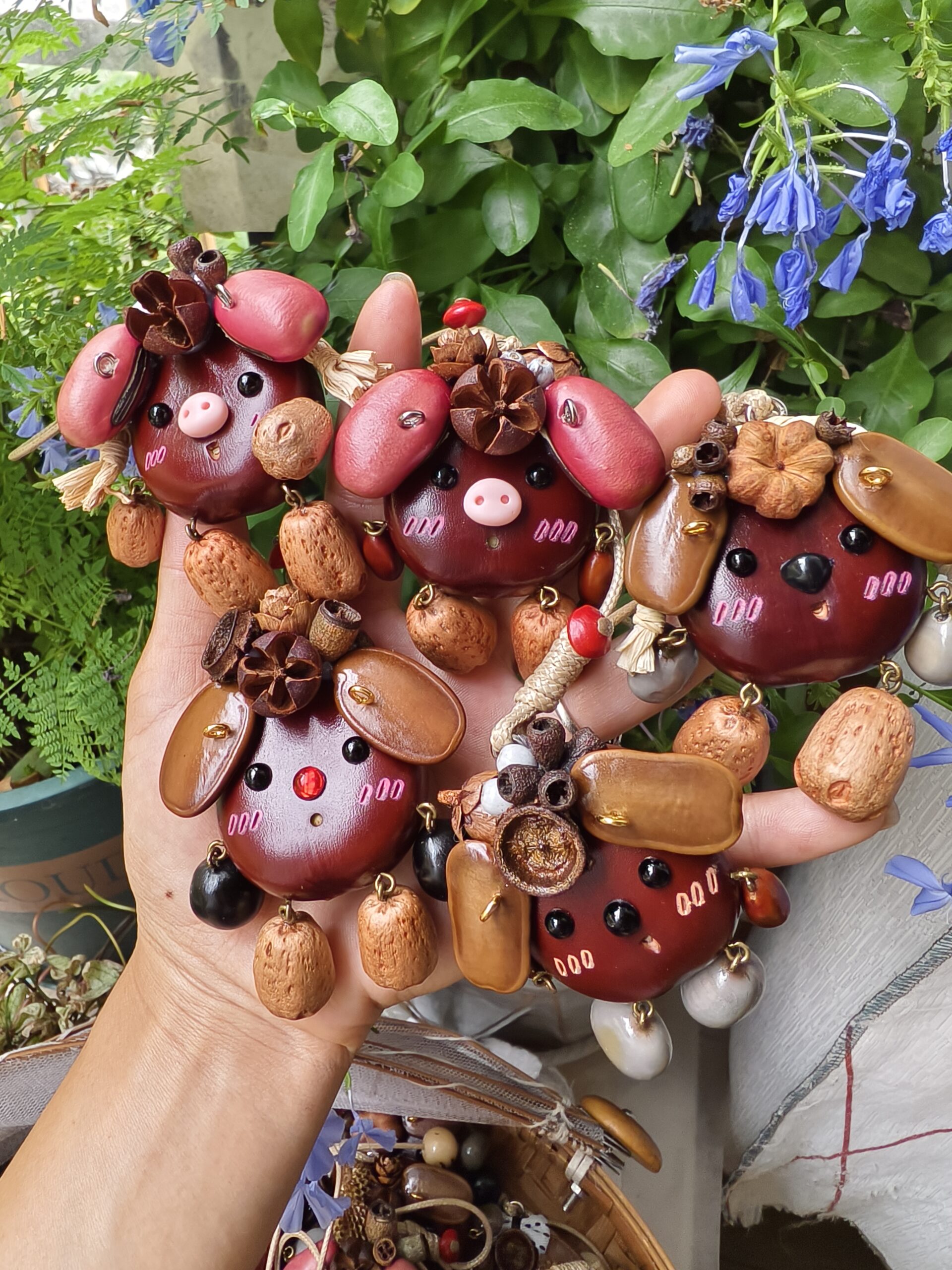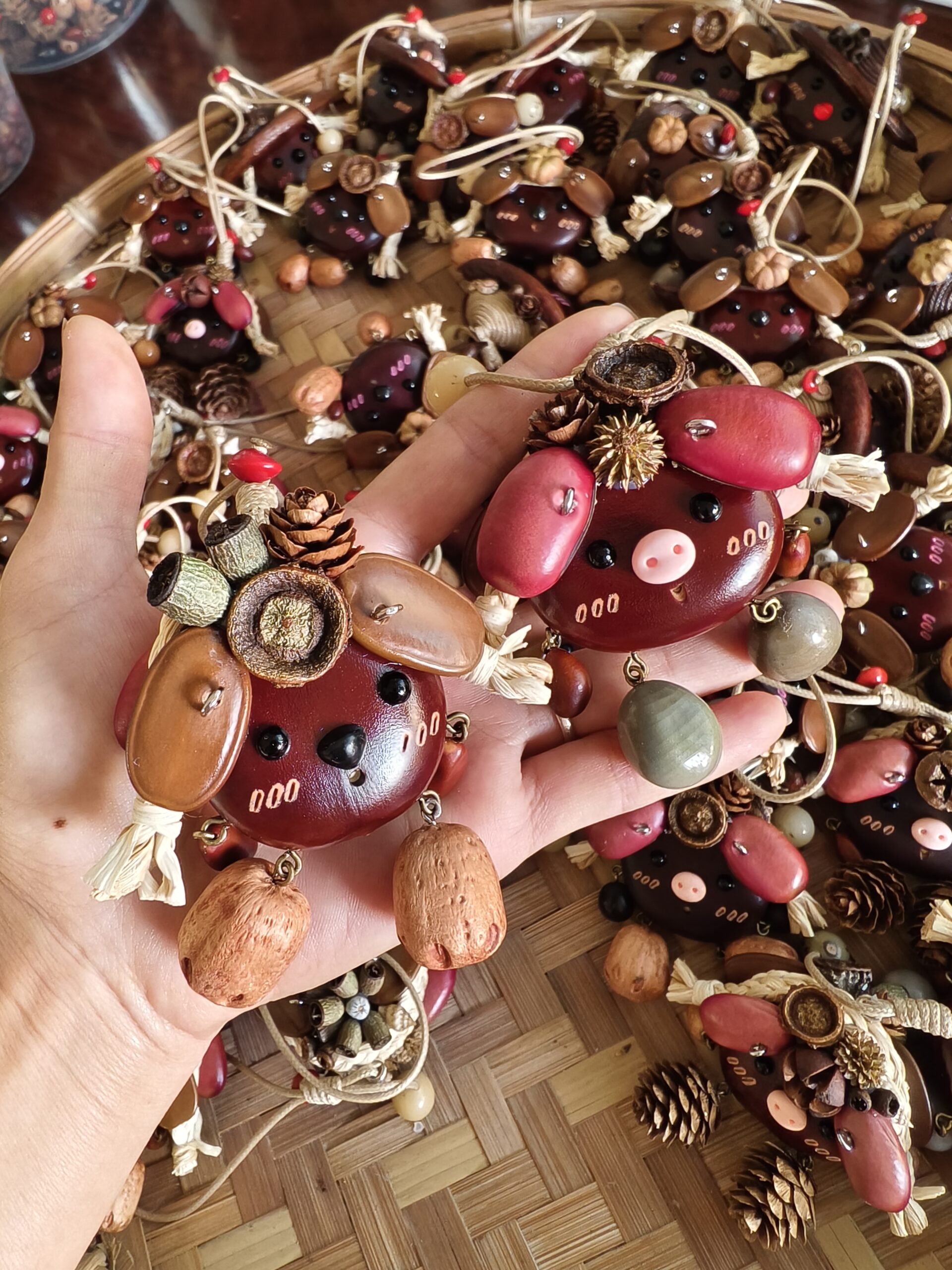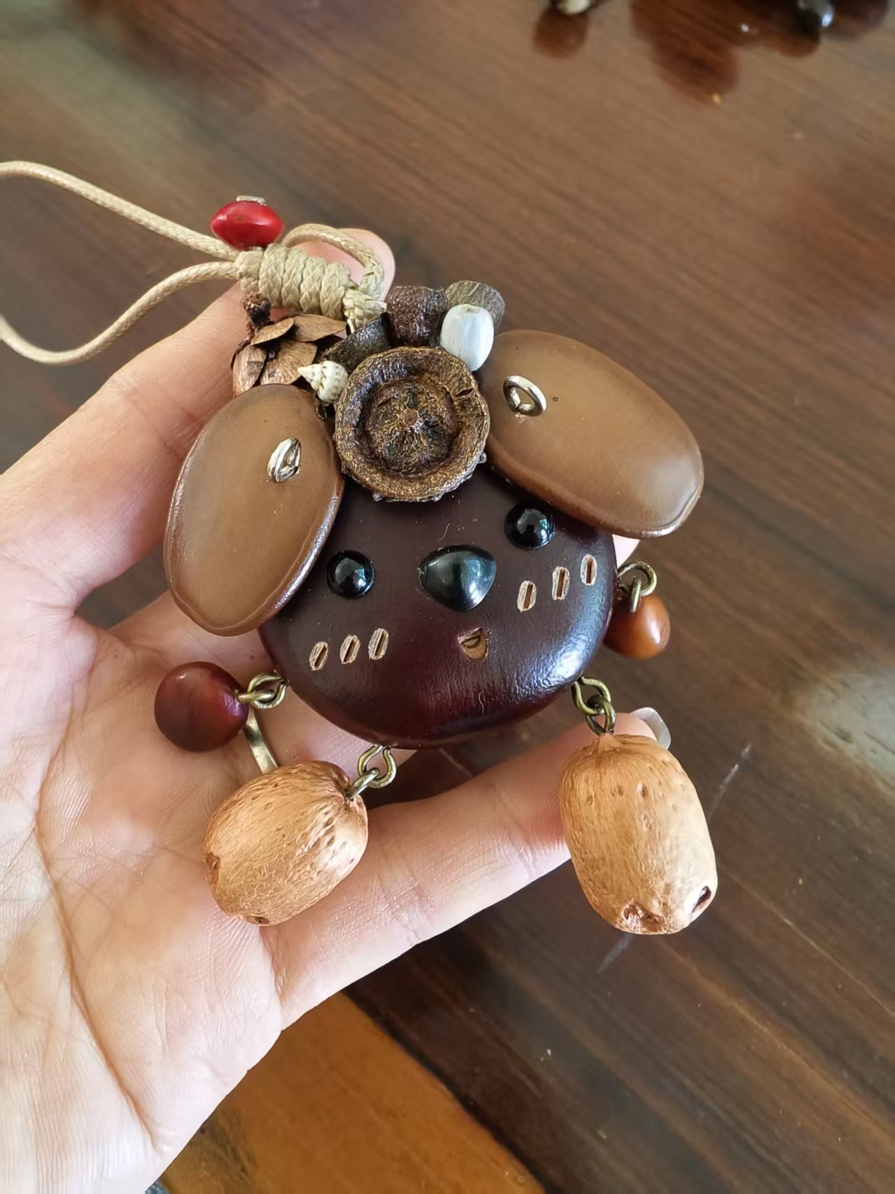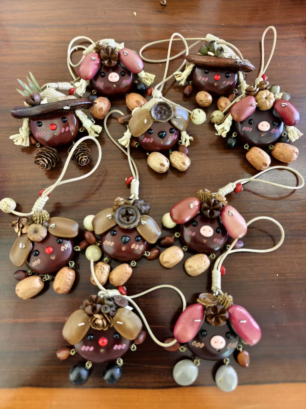 Natural Materials, Pure and Unrefined: Every “little sprite” is creatively assembled from a selection of natural plant seeds, fruits, and pods (as shown in the images, utilizing smooth dark seeds for the head, peanut-like shells for the limbs, and various small seeds and dried fruits for ears, noses, and decoration). We respect and preserve their natural forms and colors, ensuring that every charm has its own unique life imprint.